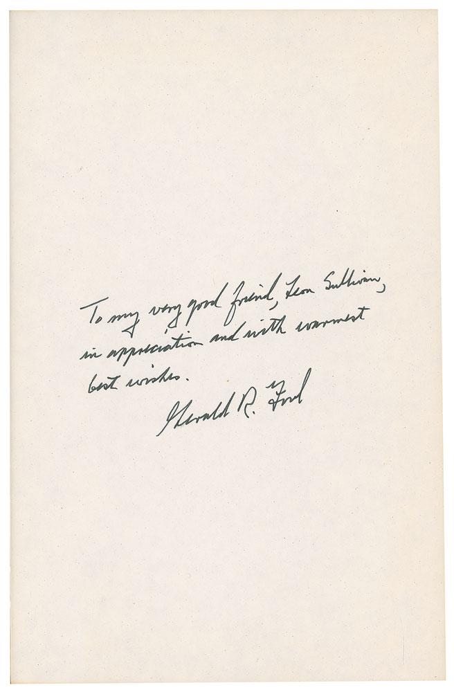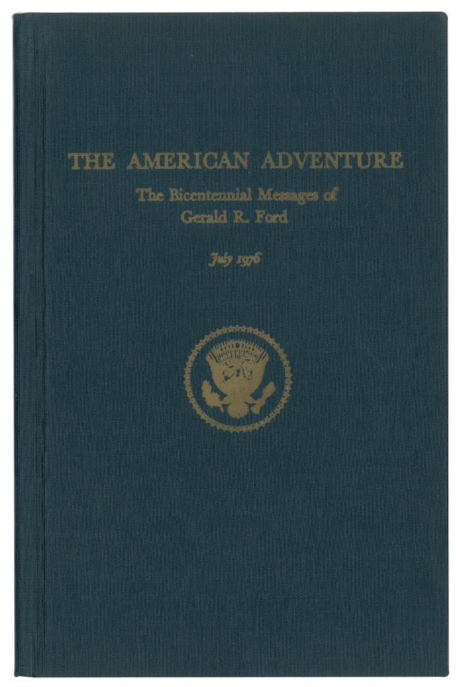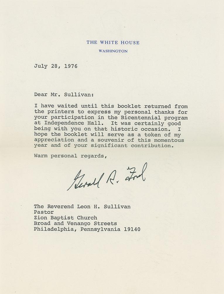 Two items: a hardcover booklet entitled "The American Adventure: The Bicentennial Messages of Gerald R. Ford," 28 pages, 6 x 9.25, signed and inscribed on the first free end page in black felt tip, "To my very good friend, Leon Sullivan, in appreciation and with warmest best wishes, Gerald R. Ford"; and a TLS as president, one page, 6.75 x 8.75, July 28, 1976, to Reverend Leon H. Sullivan, in full: "I have waited until this booklet returned from the printers to express my personal thanks for your participation in the Bicentennial program at Independence Hall. It was certainly good being with you on that historic occasion. I hope the booklet will serve as a token of my appreciation and a souvenir of this momentous year and of your significant contribution." In very fine condition.