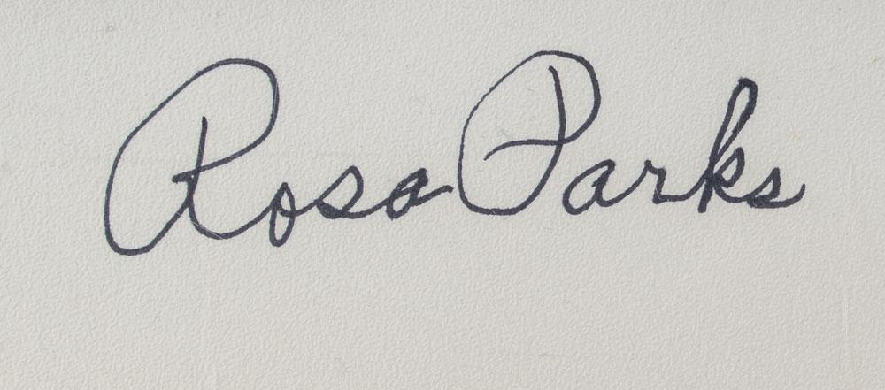 Exceptional color limited edition 24 x 19.75 print entitled "The Mentor," depicting Parks, Martin Luther King, Jr., and others during the Civil Rights movement, numbered 397/500, signed in the lower border in black felt tip by Rosa Parks. Also signed in pencil by the artist Anthony Douglas. Rolled and in fine condition. Accompanied by the publisher's certificate of authenticity and an image taken during the private signing.