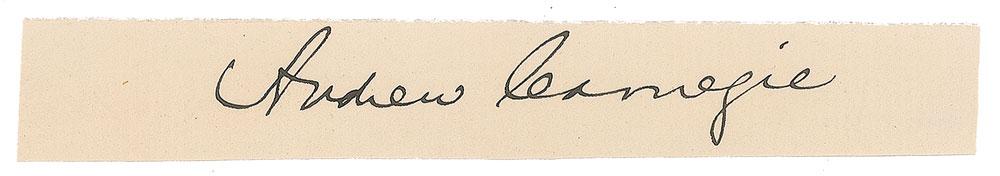 Bold fountain pen signature, "Andrew Carnegie,” on an off-white 5.5 x .75 slip. In fine condition.