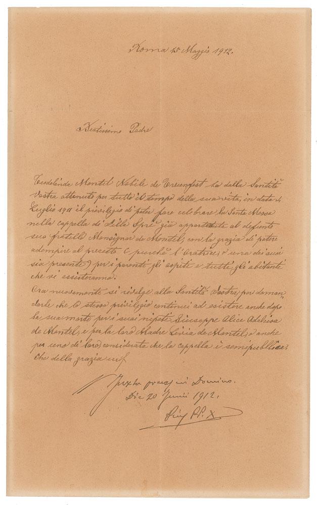 Born Giuseppe Melchiorre Sarto in 1835, Pius X served as pope from 1903 until his death in 1914. Known for his conservative, anti-modernist philosophies, he became, in 1954, the first pope to be elevated to sainthood since Pius V in 1712. Untranslated LS in Italian, signed “Pius PP. X,” one page, 8.25 x 13.5, June 20, 1912. In fine condition, with overall toning from prior display.