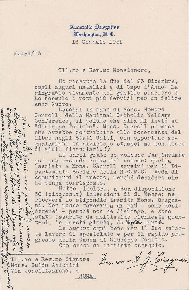 Italian Cardinal of the Roman Catholic Church (born 1883) who served as Vatican Secretary of State from 1961 to 1969, and Dean of the College of Cardinals from 1972 until his death the following year. TLS in Italian, signed “A. G. Cicognani,” one page, 5.5 x 8.5, Apostolic Delegation letterhead, January 16, 1955. Letter to Monsignor Guido Anichini, in part (translated): "I received yours on December 23rd, with Christmas and New Year's greetings: I warmly thank you for your kind thoughts and I offer you the best wishes for a happy New Year. I left in Monsignor Howard Carroll's hand, the National Catholic Welfare Conference, the volume that you sent me on 'Giuseppe Toniolo.' Archbishop Carroll promised that he would contribute to the knowledge of the book in the United States, with appropriate reports in magazines or prints; but he didn't say financial aid. I would be grateful if you would like to have a second copy of the volume sent here: the one left to Archbishop Carroll will serve for the Social Department of the N.C.W.C. Please tell me the price, because I want it paid." Cicognani adds a vertical postscript in the left margin. In fine condition. Cicognani served as the Apostolic Delegate to the United States from March 17, 1933 until November 14, 1959.