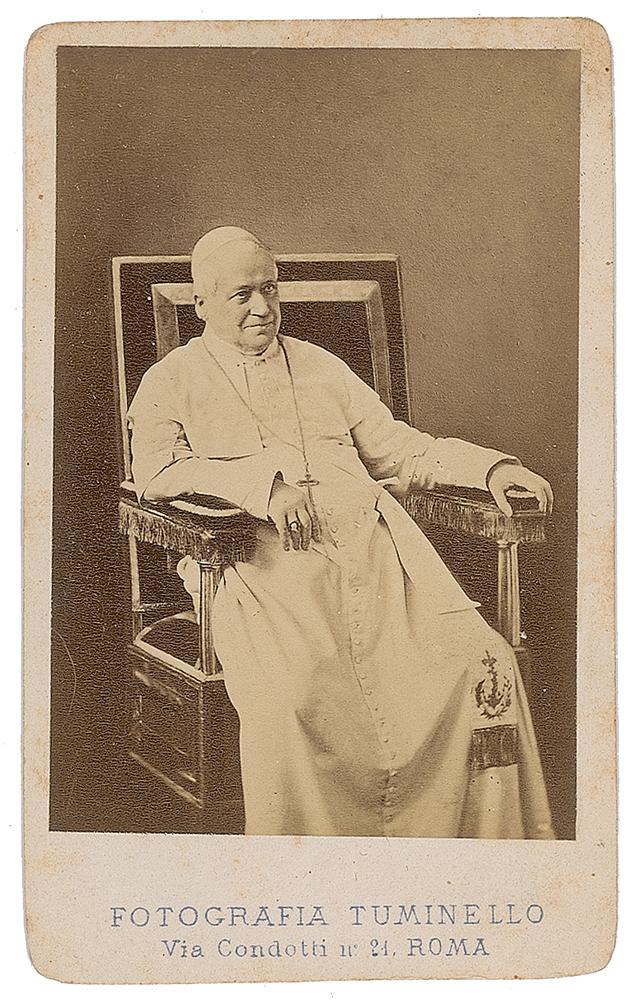 Original 2.5 x 4 carte-de-visite photograph of Pope Pius IX seated in an ornate chair, taken by Roman photographer Lodovico Tuminello. In fine condition. Pius IX was the first pope to be photographed.