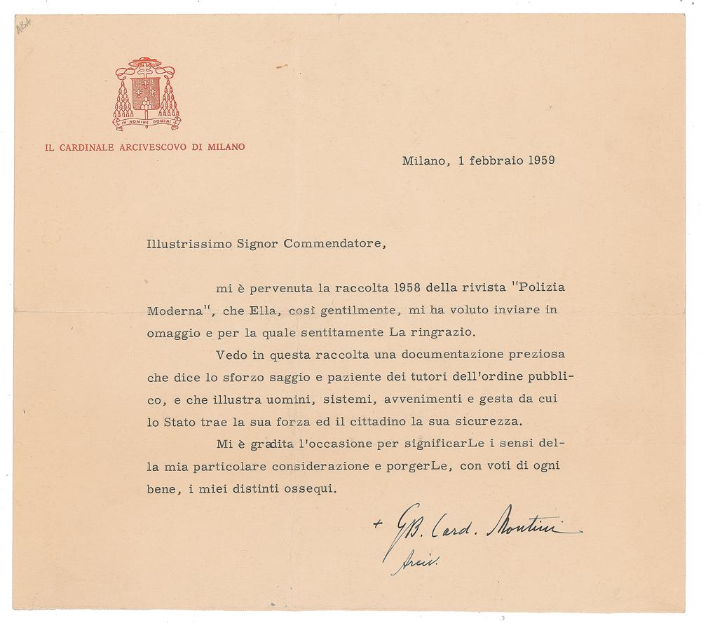 Born Giovanni Battista Enrico Antonio Maria Montini in Italy in 1897, Paul VI reigned as pope from 1963 until his death in 1978. TLS in Italian, signed “G. B. Card. Montini, Arciv.,” one page, 8.5 x 7.5, Cardinal Archbishop of Milan letterhead, February 1, 1959. Letter sending thanks for a collection of 'Modern Police' magazines, in part (translated): "I see in this collection a precious documentation that says the wise and patient effort of the guardians of public order, and that illustrates men, systems, events and deeds from which the State draws its strength and the citizen its security." In fine condition, with intersecting folds.