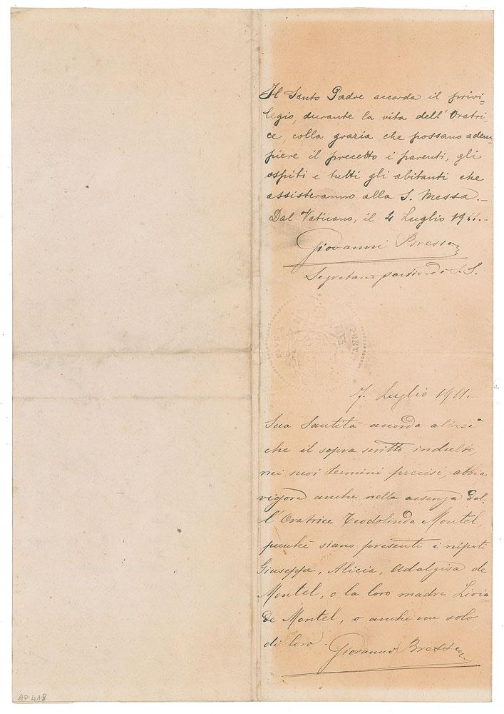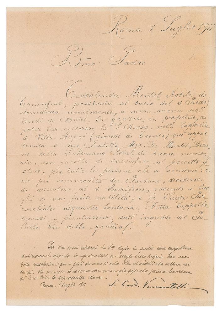 Italian prelate of the Roman Catholic Church (1836-1930) who spent his career in the foreign service of the Holy See and was made a cardinal in 1890. Manuscript DS, in Italian, signed “S. Card. Vannutelli,” one page, 8.75 x 12.5, July 1, 1911. Untranslated document signed at the conclusion by Vannutelli. In fine condition, with light toning from prior display.