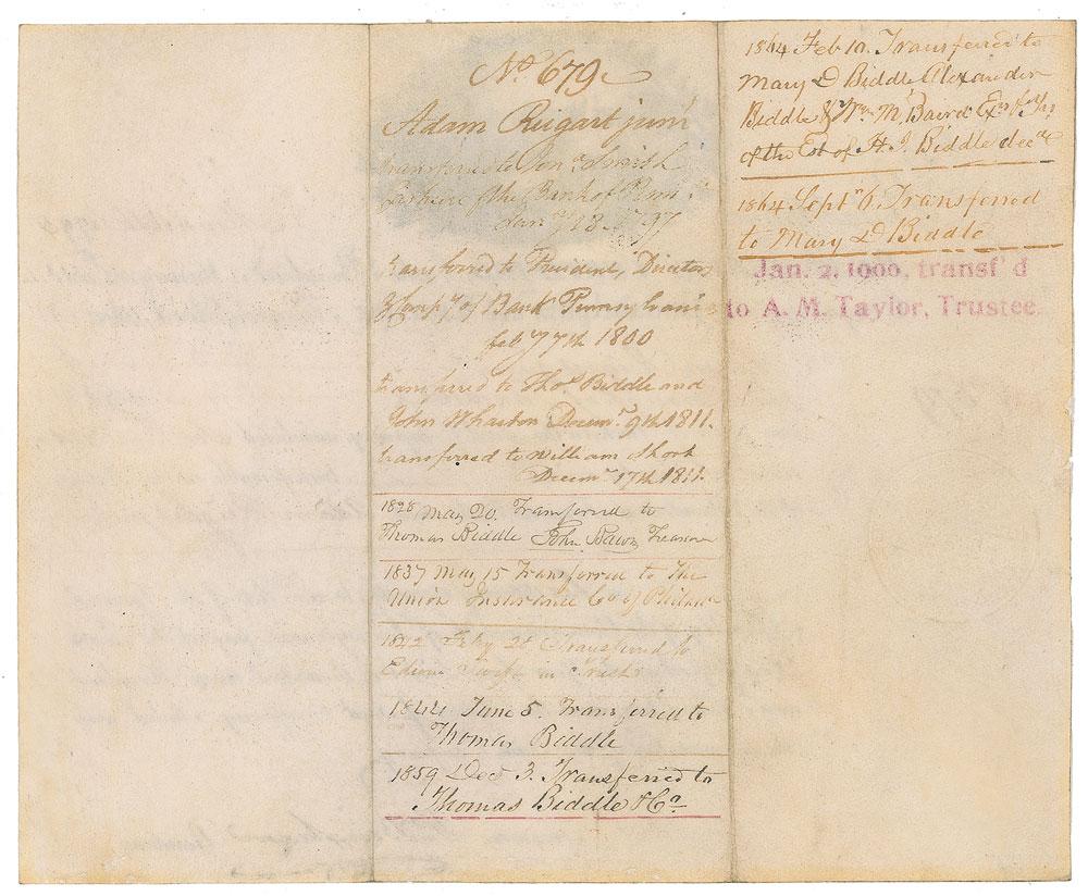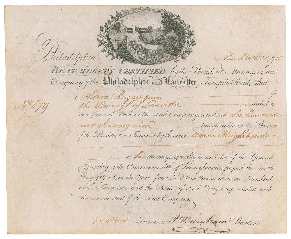 American statesman (1752-1804) who served in the Continental Congress from 1786 to 1788 and in the United States Senate from 1795 to 1801, including a five-month stint as president pro tempore. Partly-printed vellum DS, signed “Wm. Bingham,” one page, 9.25 x 7.75, March 16, 1795. Certificate issued to Adam Reigant for one share of stock in the "Company of the Philadelphia and Lancaster Turnpike Road." Signed at the conclusion in ink by Bingham as the company's president. In fine condition.