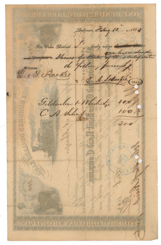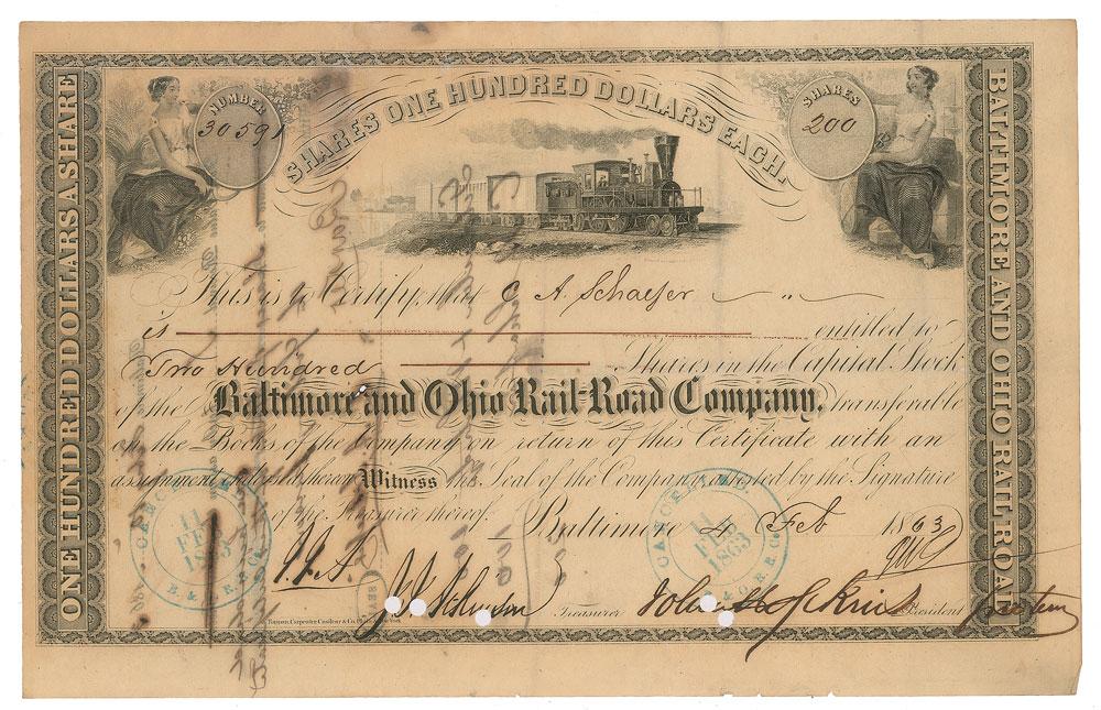 American entrepreneur, abolitionist and philanthropist (1795-1873) whose legacy lives on in numerous foundations and institutions, such as Johns Hopkins Hospital and Johns Hopkins University. Partly-printed DS, one page, 10 x 6.5, February 4, 1863. Stock certificate for 200 shares in the Baltimore and Ohio Rail-Road Company issued to C. A. Schaefer, signed at the conclusion by Hopkins as the company's president. In fine condition, with two small cancellation holes touching the signature.
