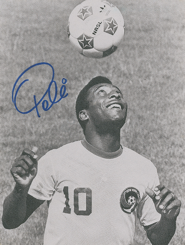Two items: a 4 x 5.25 paperstock photo of Pele in his New York Cosmos jersey, signed in felt tip; and a color 4.25 x 6 cardstock photo of Diego Maradona playing for S.S.C. Napoli, signed in black felt tip. In fine condition, with light wrinkling to Pele.