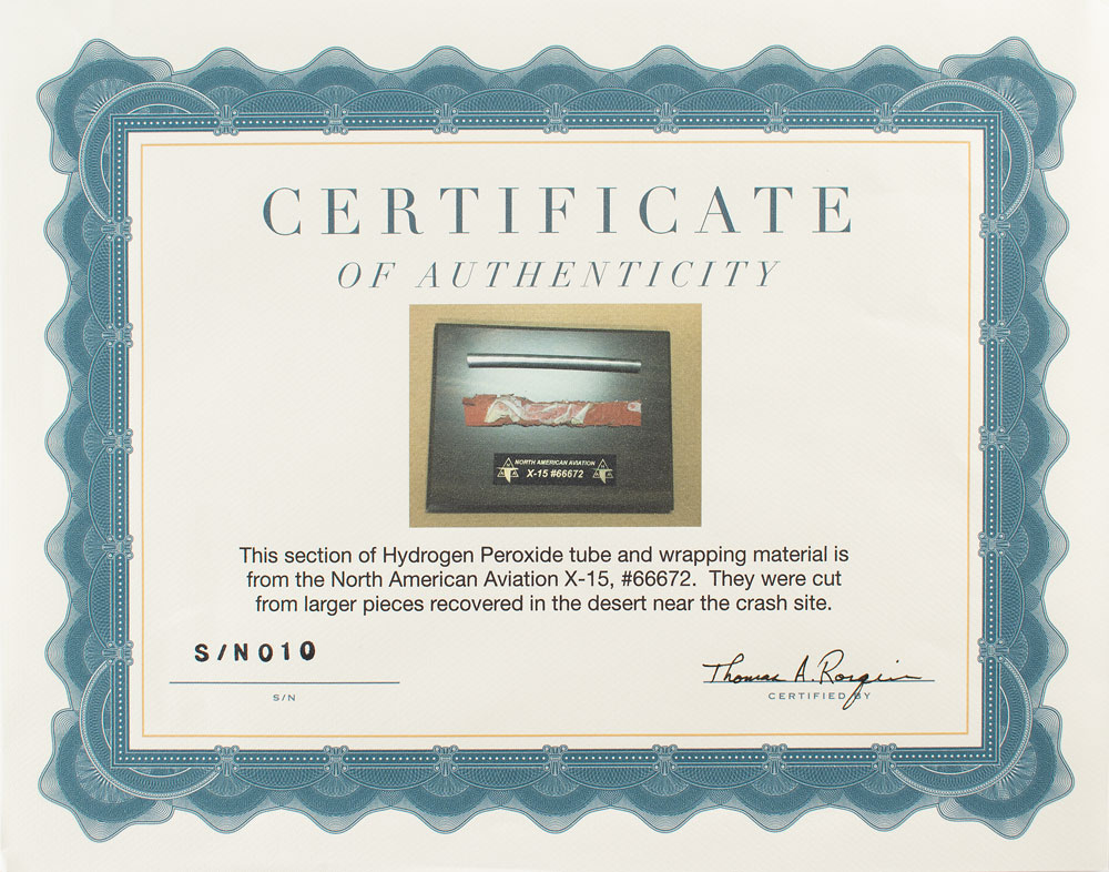 Flown section of hydrogen peroxide tubing and wrapping material recovered from the crash site of North American Aviation X-15 #66672, each measuring about 6.25″ long and affixed to an 8″ x 6″ plaque. Piloted by Michael J. Adams on November 15, 1967, the X-15 began a rapid pitching motion of increasing severity while shooting downward at 160,000 feet per minute. As the X-15 neared 65,000 feet, it was speeding downward at Mach 3.93 and broke up into many pieces amid loud sonic rumblings. Adams's death in the crash marked the first American space mission fatality. In fine condition.