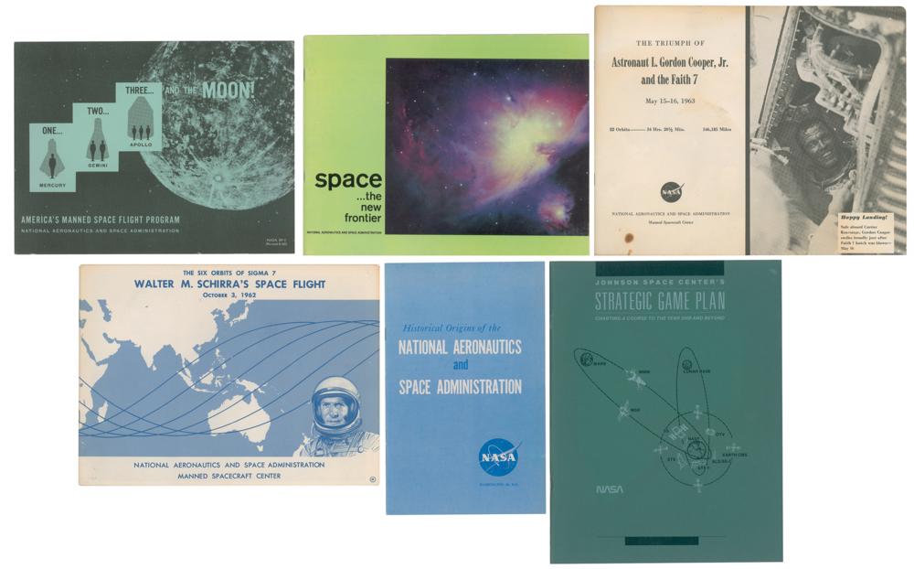Group lot of six NASA booklets, five of which were published in 1963 and focus on the Mercury, Gemini, and Apollo programs, and one in 1987 that deals with the Space Shuttle. Titles include: 1-2-3 and the Moon: America's Manned Space Flight Program (1963); Historical Origins of the National Aeronautics and Space Administration (1963); Johnson Space Center's Strategic Game Plan: Charting a Course to the Year 2000 and Beyond (1987); Space…the New Frontier (1963); The Six Orbits of Sigma 7: Walter M. Schirra's Space Flight, October 3, 1962 (1963); and The Triumph of Astronaut L. Gordon Cooper, Jr. and the Faith 7: May 15-16, 1963 (1963). In overall very good to fine condition, with some rippling to JSC and Cooper booklets, with the latter also bearing some toning and stains.