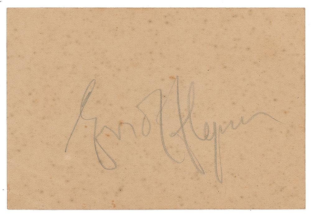 Vintage pencil signature, "Errol Flynn,” on the reverse of an off-white 4.5 x 3 table reservation card from the Copacabana Palace, dated July 8, 1940 on the opposite side. In very good condition, with creasing to the lower left corner, and overall foxing affecting appearance.