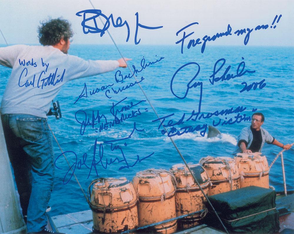 Color satin-finish 10 x 8 photo of Hooper instructing Chief Brody to move to the bow of the Orca, signed in blue felt tip seven cast and production members from the film, including: "Richard Dreyfuss," "Foreground my ass! Roy Scheider," "Susan Backlinie, Chrissie," "Jeffrey Kramer, 'Hendricks,'" "Ted Grossman, 'Estuary Victim,'" "Words by Carl Gottlieb," and "Joe Alves," who adds a shark sketch. In very fine condition.