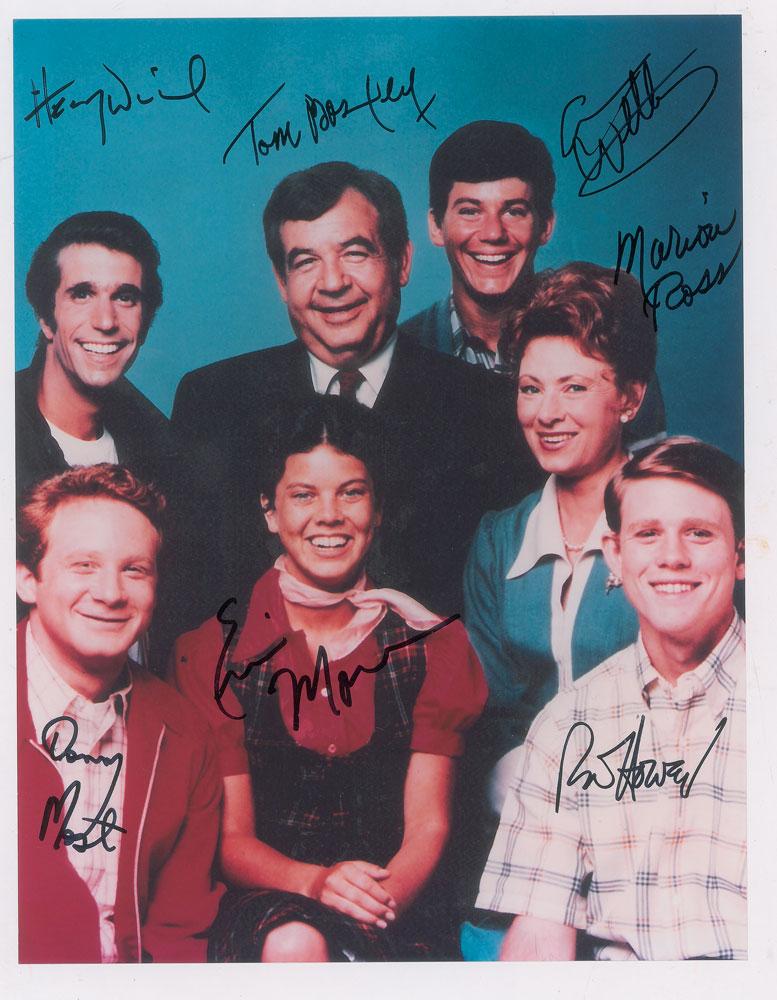 Color glossy 10 x 13 photo of the cast of Happy Days, signed in black felt tip by Henry Winkler, Donny Most, Erin Moran, Tom Bosley, Anson Williams, Marion Ross, and Ron Howard. In fine condition.