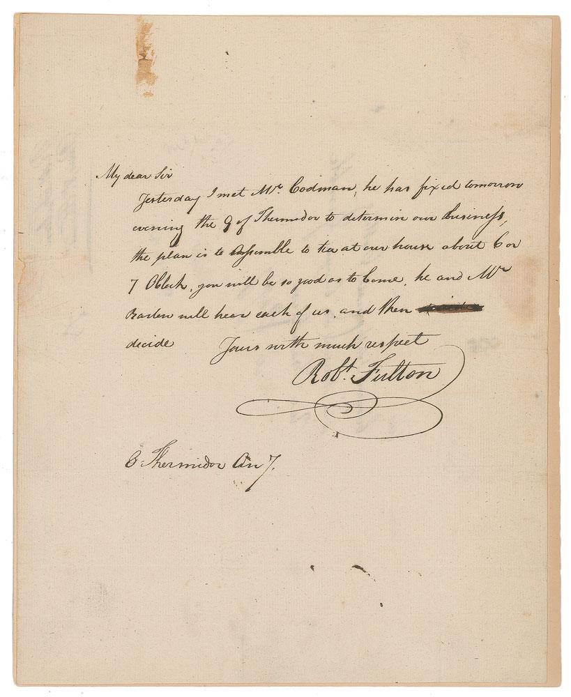 American inventor, engineer, and entrepreneur (1765-1815) best known for designing the first commercially successful steamboat. His other endeavors included a commission from Napoleon that resulted in the first practical submarine, the Nautilus. Rare ALS signed “Rob't Fulton,” one page, 7.75 x 9.75, 8 Thermidor an 7 [July 26, 1799]. Letter to Nathaniel Cutting in Paris, in full: "Yesterday I met Mr. Codman, he has fixed tomorrow evening the 9 of Thermidor to determine out business, the plan is to assemble?at our house about 6 or 7 o'clock, you will be so good as to come, he and Mr. Barlow will hear each of us and then decide." Affixed by its left edge to a slightly larger sheet. In very good to fine condition, with intersecting folds and a stain to the top of the first page; the integral address leaf has two edge tears and seal-related paper loss. A fantastic, boldly penned letter by the steamboat inventor, written while he was in Napoleon's France and working on the design of the Nautilus submarine.