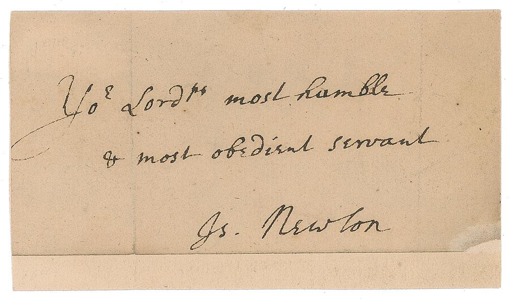 English physicist, mathematician, and astronomer (1642-1727), widely regarded as the most influential figure in the history of science, whose ideas and discoveries, including calculus, the laws of gravitation and motion, and observations on the nature of light and optics, earned him a place among the most profound geniuses in the history of mankind. Bold and crisp ink signature, "Yo'r Lord'ps most humble & most obedient servant, Is. Newton,” on an off-white 4 x 2 slip affixed to a slightly larger card. In fine condition. A superb example of this extremely desirable scientific signature.