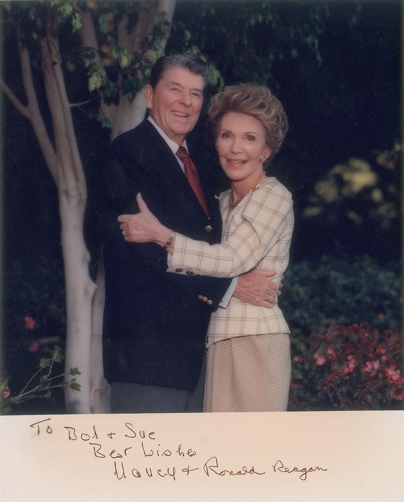 Color satin-finish 8 x 10 photo of the Reagans posing in a warmhearted embrace, signed and inscribed in the lower border in black ink, "To Bob & Sue, Best wishes, Nancy &" and "Ronald Reagan.” In fine condition, with a trivial brush to the first word in the inscription.