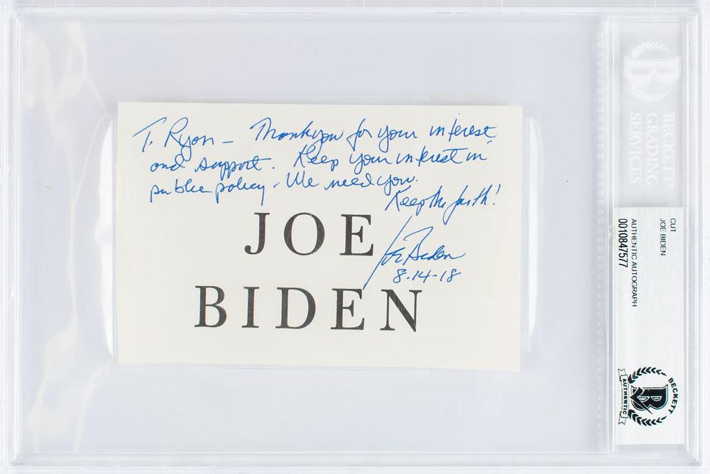 Felt tip signature and inscription, "To Ryan—Thank you for your interest and support. Keep your interest in public policy—we need you. Keep the faith! Joe Biden, 8-14-18,” on an off-white 5 x 3.25 sheet imprinted with Biden's name. In fine condition. Encapsulated in a Beckett authentication holder