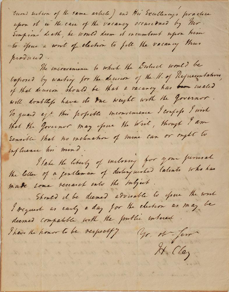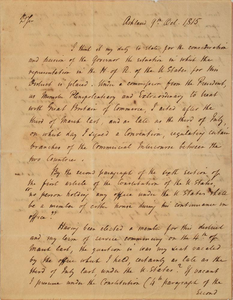 Interesting ALS signed “H. Clay,” one page both sides, 7.75 x 9.75, October 9, 1815. Letter to M. D. Hardin, in part: "I think it is my duty to state for the consideration and decision of the Governor the situation in which the representation in the H. of R. of the U. States for this District is placed. Under a commission from the President, as Minister Plenipotentiary and Extraordinary to treat with Great Britain of Commerce, I acted after the third of March last, and as last as the third of July, on which day I signed a Convention, regulating certain branches of the Commercial Intercourse between the two Countries. By the second paragraph of the sixth section of the first article of the Constitution of the U. States, 'no person holding any office under the U. States shall be a member of either house during his continuance in office.' Having been elected a member for this district and my term of service commencing on the 4th of March last, the question is was my seat vacated by the office which I held, certainly as late as the third of July last, under the U. States??I take the liberty of inclosing for your perusal the letter of a gentleman of distinguished talents who has made some research into the subject." In very good to fine condition, with light toning and staining. Accompanied by the detached address panel, with the center panel addressed in Clay's own hand. Clay's tenure as a Kentucky congressman was interrupted from 1814 to 1815, when he traveled to Europe to sign a commercial convention as minister plenipotentiary to Great Britain. His worries concerning his vacated former seat were allayed not long after having written this letter; on October 30, 1815, Clay filled his own vacancy when he was elected in a special election as a Democratic Republican to the Fourteenth Congress. A fascinating bit of Clay history.