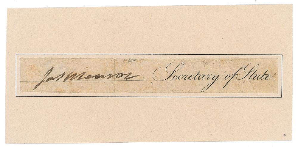 Ink signature as secretary of state, "Jas. Monroe,” on an off-white 4.75 x .75 slip clipped from a document, professionally inlaid into a slightly larger card. In fine condition, with a short vertical fold passing through Monroe's last name.