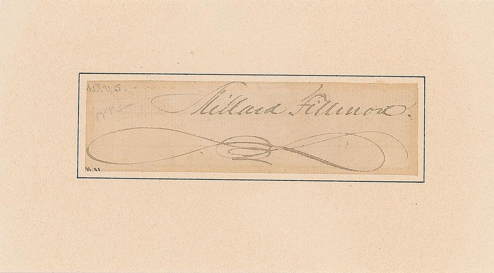 Ink signature, "Millard Fillmore,” on an off-white 3.25 x 1 slip, professionally inlaid into a slightly larger card. In fine condition.