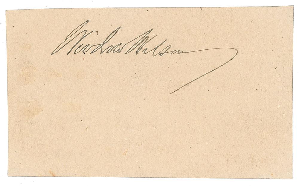 Nice ink signature, "Woodrow Wilson,” on an off-white 4.25 x 2.75 slip. In fine condition, with some light soiling to the left edge.