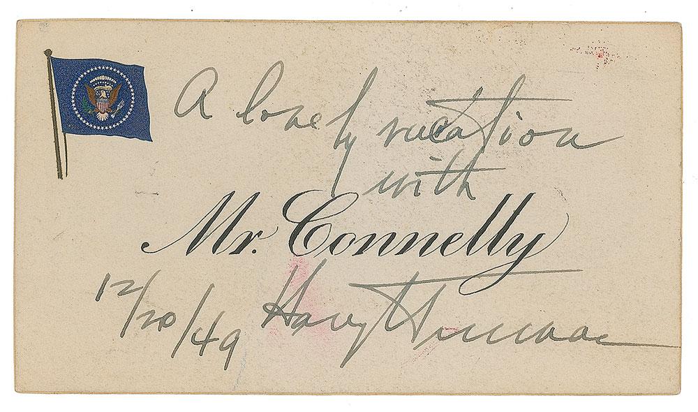 Scarce fountain pen signature as president, "A lovely vacation with [Mr. Connelly], Harry S. Truman, 12/20/49,” on an official off-white 4 x 2.25 placecard from the USS Williamsburg imprinted with "Mr. Connelly." In fine condition, with a faint pink stain touching the signature. President Truman vacationed in Key West from November 28-December 20, 1949; the USS Williamsburg served as the presidential yacht from 1945 to 1953. Matthew J. Connelly was President Truman's Appointments Secretary.
