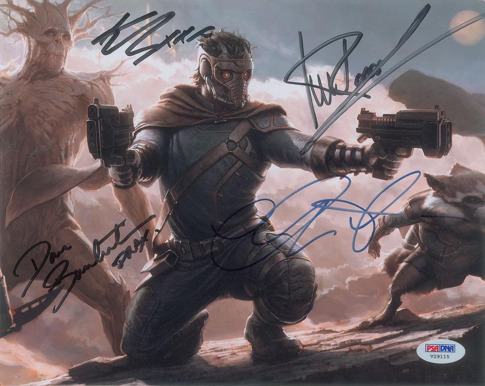 Color satin-finish 10 x 8 photo of artwork depicting Guardians of the Galaxy characters Star-Lord, Groot, and Rocket, signed in black felt tip by Chris Pratt, Michael Rooker, Karen Gillan, and Dave Bautista, who adds "Drax." In fine condition, with a PSA/DNA label affixed to lower right corner (certificate not present).