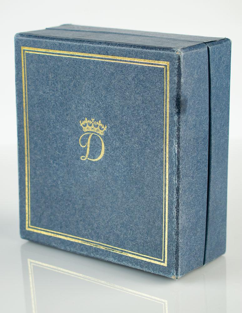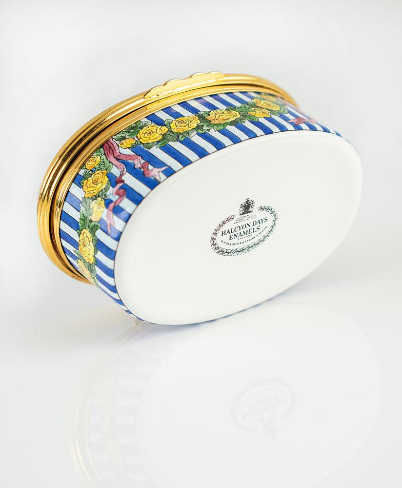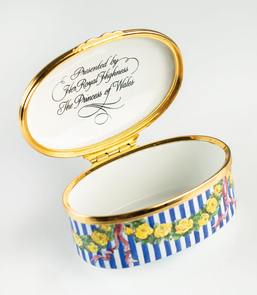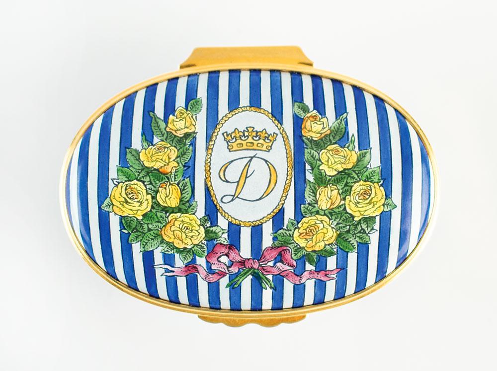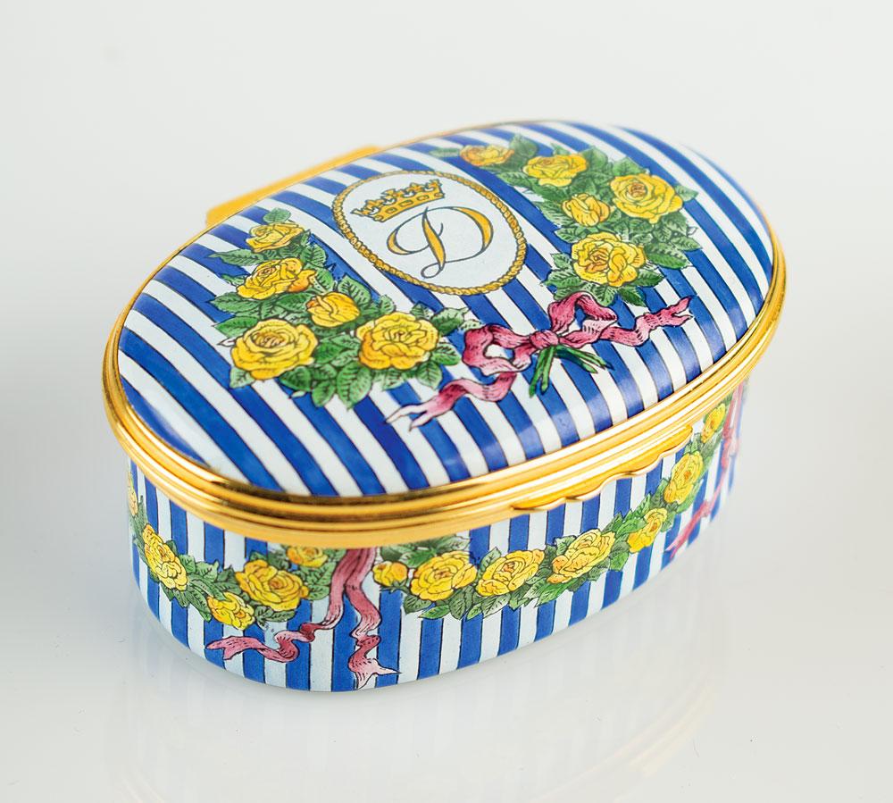 Stunning personalized Halcyon Days Enamels gift box presented by Princess Diana to a staff member at the Hotel Arlberg in March 1993. The hand-made and hand-enameled oval box, which measures 2.5 x 1.25 x 2, features 24k gold-plated fittings, with a blue-and-white striped pattern with yellow roses to base and cover, the latter bearing the monogram of Princess Diana and the underside inscribed with cursive text: “Presented by Her Royal Highness, The Princess of Wales.” Bottom of base features the Halcyon Days maker’s mark. Includes the original blue presentation box with the cover featuring the Princess Diana monogram. In fine condition.