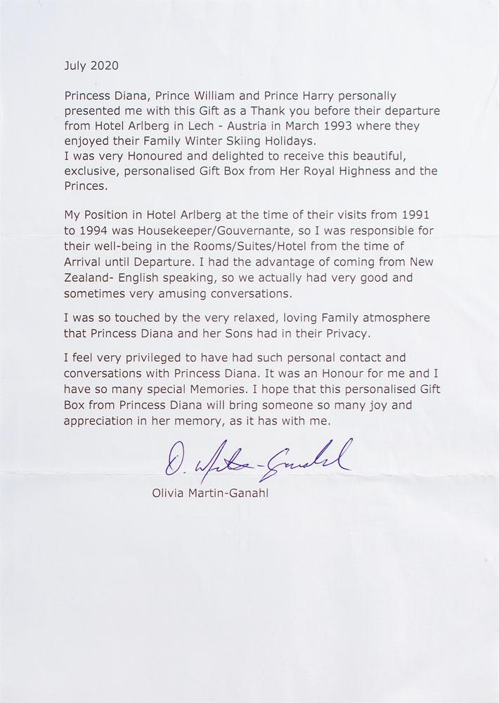 Accompanied by a letter of provenance from the recipient: “Princess Diana, Prince William and Prince Harry personally presented me with this gift as a thank you before their departure from Hotel Arlberg in Lech-Austria in March 1993 where they enjoyed their Family Winter Skiing Holidays…My position in Hotel Arlberg at the time of the visits from 1991 to 1994 was Housekeeper/Gouvernante, so I was responsible for their well-being in the rooms/suites/hotel from the time of arrival until departure…I was so touched by the very relaxed, loving family atmosphere that Princess Diana and her sons had in their privacy.”