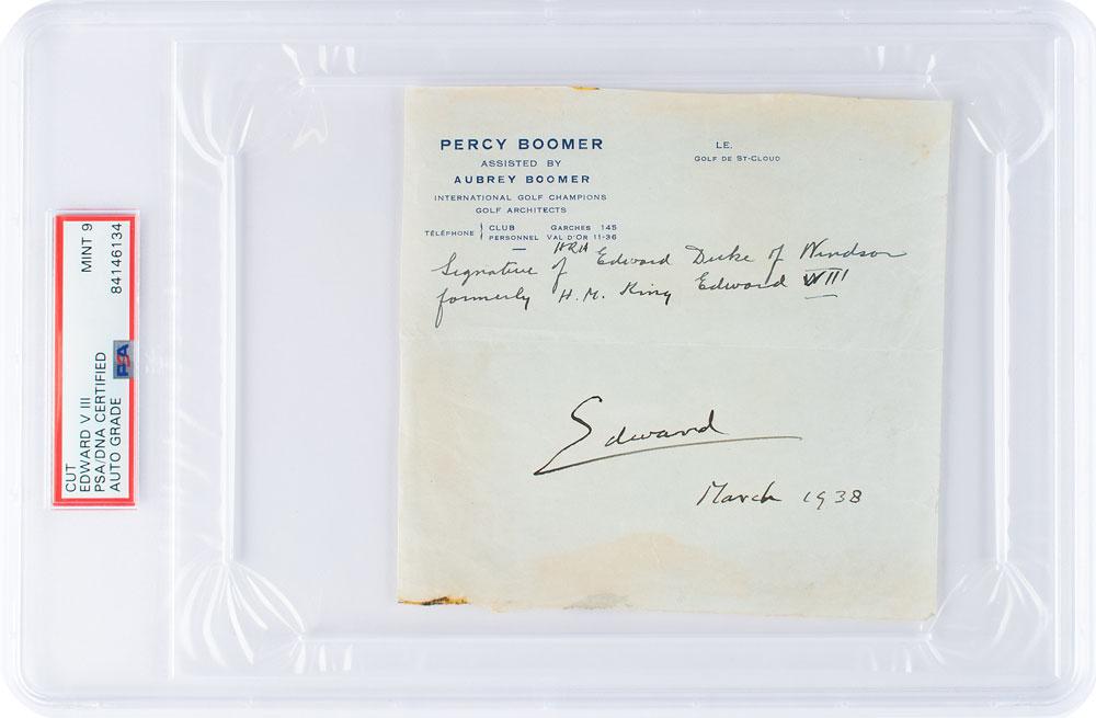 Fountain pen signature, "Edward, March 1938,” on an off-white 5 x 4.75 sheet of personal Percy Boomer letterhead, which bears collector's notations. In very good to fine condition, with some light staining and creasing, and a central horizontal fold. Encapsulated and graded by PSA/DNA as "MINT 9."