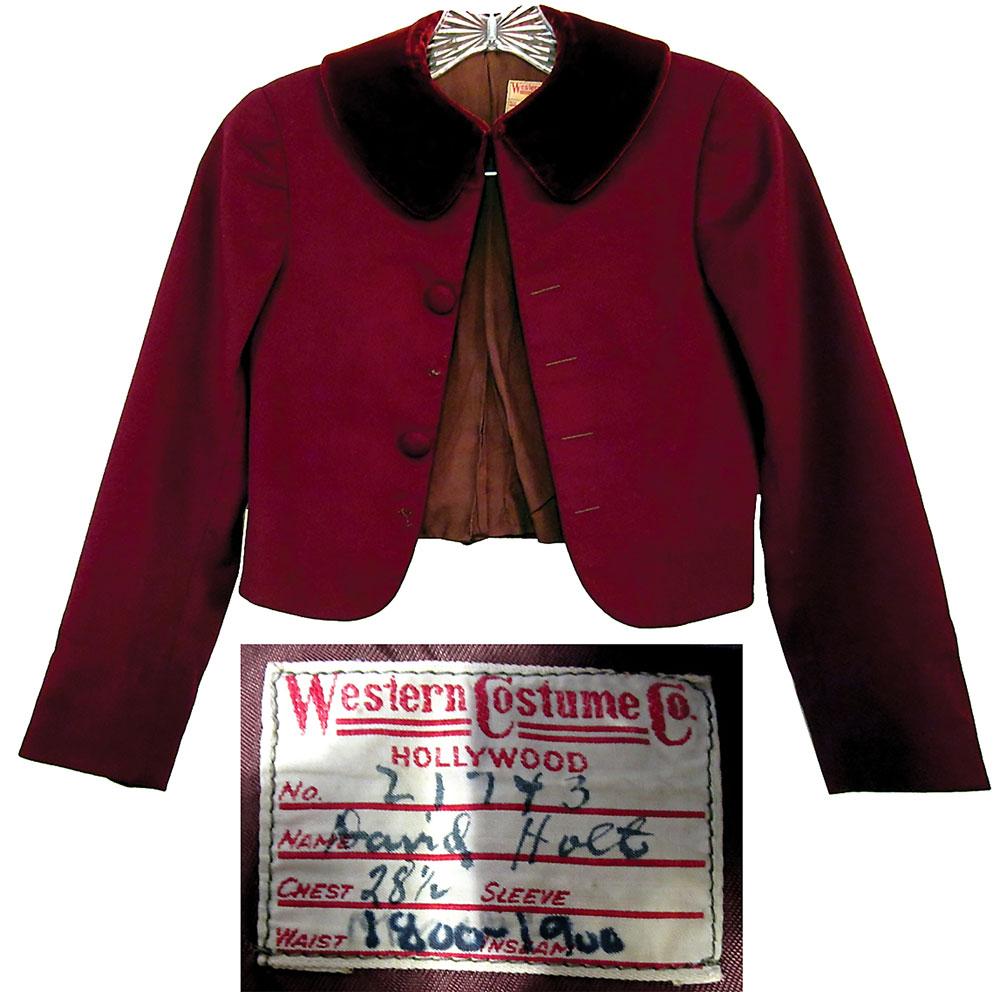 A small red coat worn by child actor David Holt, who portrays Tom's bratty brother Sid in Selznick's 1938 screen adaptation of The Adventures of Tom Sawyer. The Western Costume Co. label reads: "No. 21743, Name: David Holt, Chest 28 1/2, 1800-1900." In the end, Sid gets his just desserts. A very early Technicolor film of the classic Mark Twain book, produced by David O. Selznick just before Gone With the Wind.