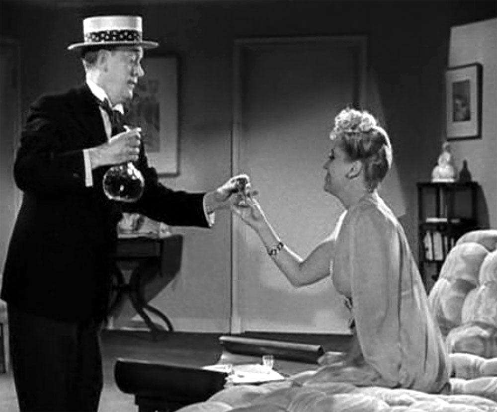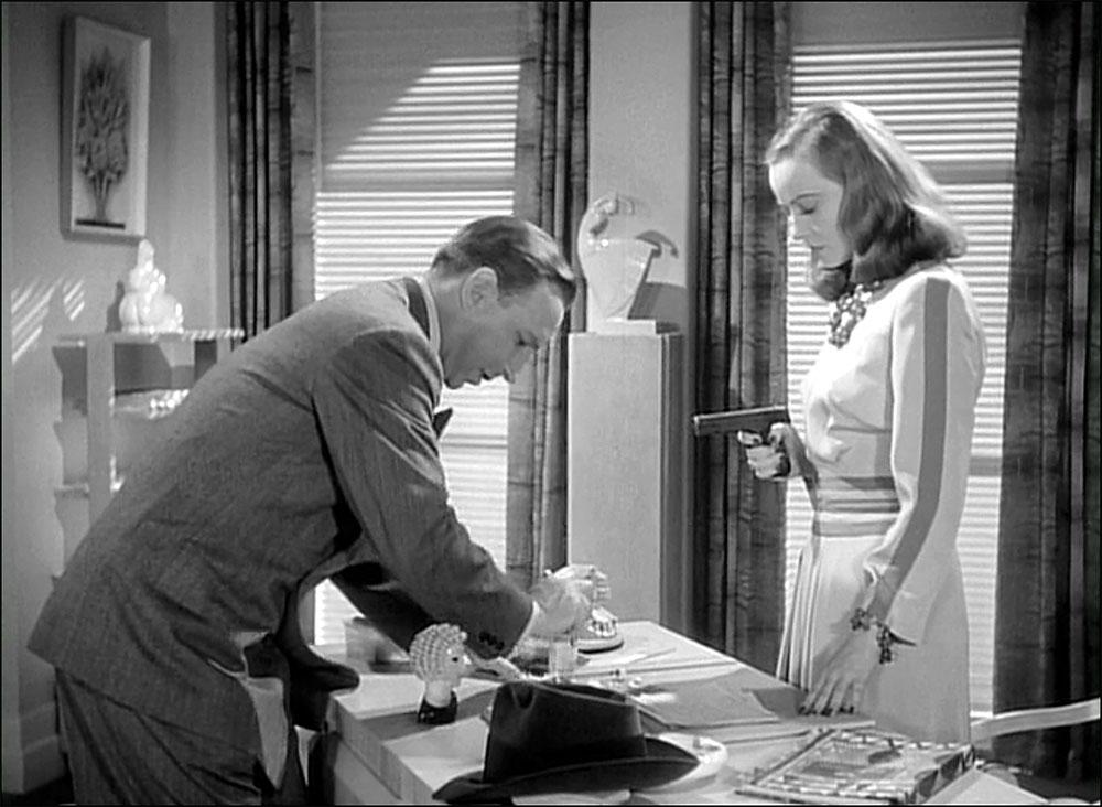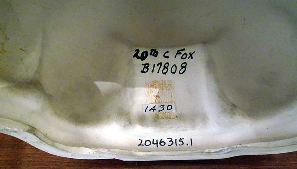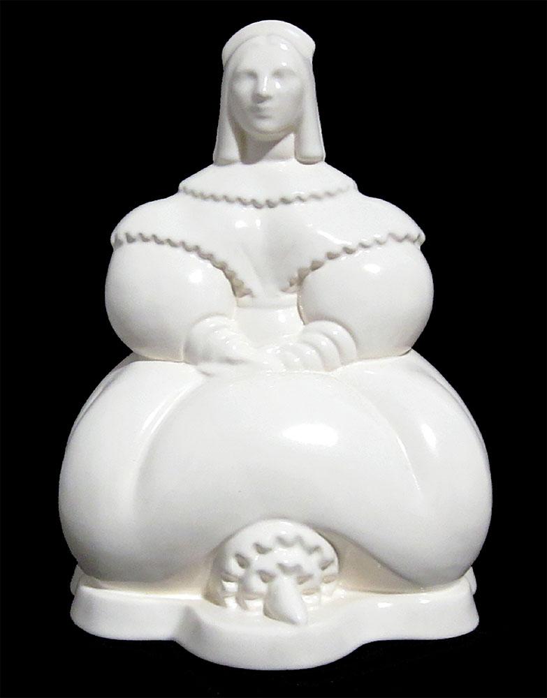 A large, white, high-gloss glazed sitting deco lady, measuring 11″ tall and 8″ wide at the base, designed by the Hamilton sisters for Vernon Kilns. These pieces of art ware are extremely rare in their own right, and are highly sought by collectors. They must also have caught the eye of Tom Little, set decorator for 20th Century Fox (six-time AA winner) as he acquired this, two Saris figures and a flowing hair bust to use in Fox films. One is shown in the Vernon Kilns book with Fox numbers. This piece was first used in Blue, White and Perfect (1941), the fourth of the Michael Shayne, Detective series. Later, it appeared in Jitterbugs with Laurel and Hardy, in Lee Patrick's room, where the boys have lots of business. Interior marked with 20th Century Fox and inventory number, "20th C Fox, B17808, 1430, 2046315.1."