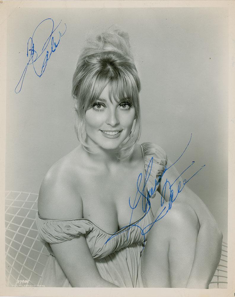 Promising American actress (b. 1943) and wife of director Roman Polanski who was propelled into infamy when she was murdered by the Manson Family at the age of 26 in the notorious killing spree that shook the nation in the summer of 1969. Scarce and remarkable vintage glossy 8 x 10 publicity photo of Tate in a seductive low-cut blouse, signed and inscribed in fountain pen, "For Peter, Sharon Tate." In fine condition, with some light creasing to the corners and trivial feathering to the inscription and signature. A truly exceptional portrait and one of the most ravishing images of Tate we have encountered.