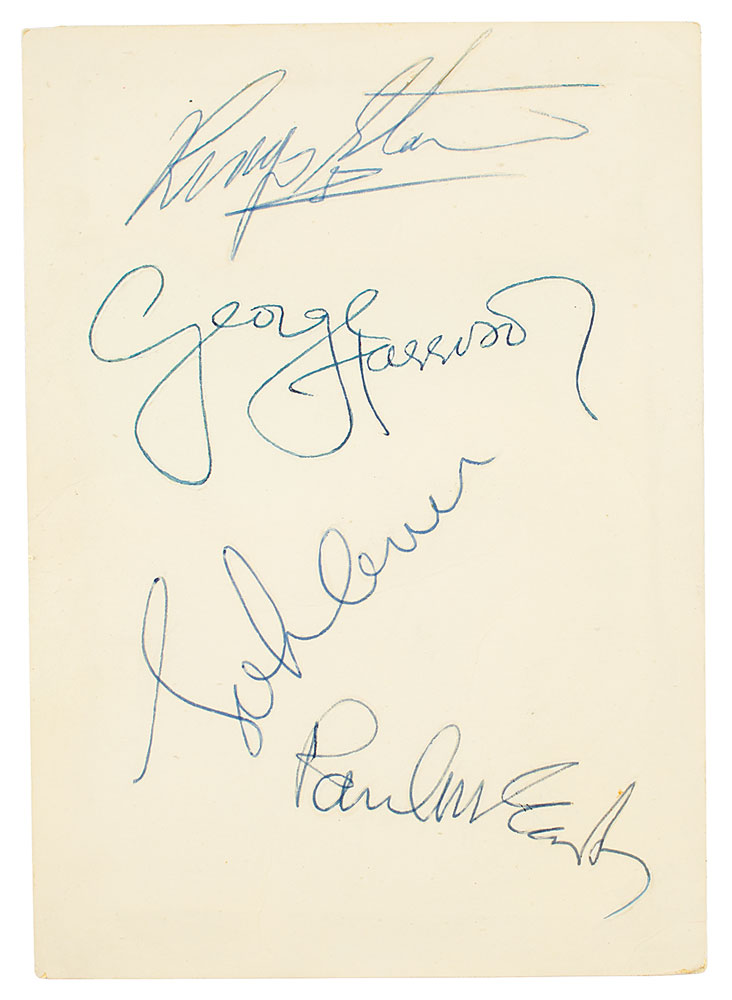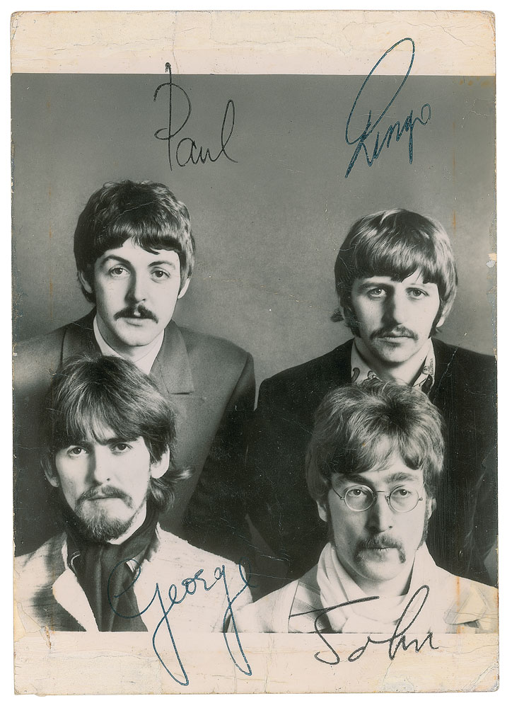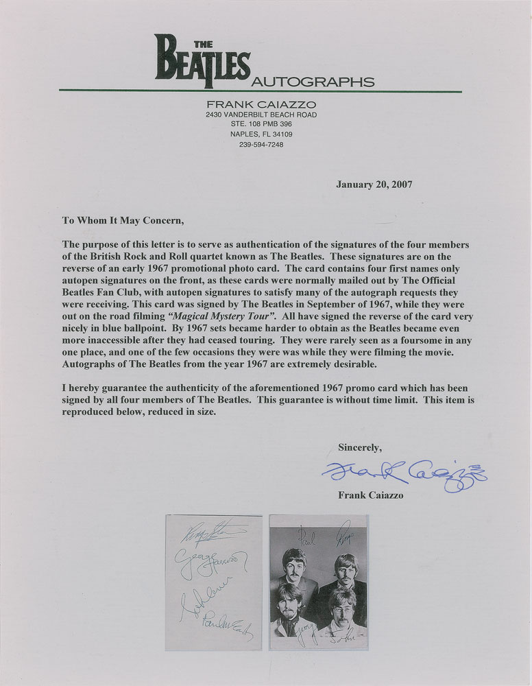 Accompanied by a letter of authenticity from noted Beatles expert Frank Caiazzo, who states: "This card was signed by The Beatles in September of 1967, while they were out on the road filming 'Magical Mystery Tour'…By 1967 sets became harder to obtain as the Beatles became even more inaccessible after they had ceased touring. They were rarely seen as a foursome in any one place, and one of the few occasions they were was while they were filming the movie. Autographs of The Beatles from the year 1967 are extremely desirable."