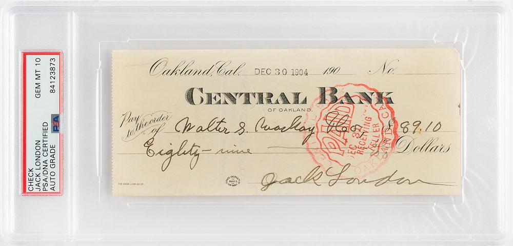 Central Bank of Oakland check, 6.5 x 2.75, filled out and signed by Jack London, payable to Walter S. Mackay & Co. for $89.10, December 30, 1904. In fine condition, with London going over the first letter of his signature. Encapsulated in a plastic PSA/DNA authentication holder, grading the autograph as "GEM MT 10."