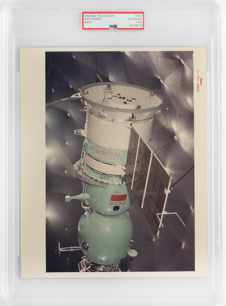 Official color glossy 10 x 8 red-numbered NASA photo (S-73-28601), which shows a close-up view of the Soyuz spacecraft which was part of the Apollo-Soyuz Test Project exhibit at the 30th International Aeronautics and Space Exhibition held May 24 to June 3, 1973, at the Le Bourget Airport in Paris, France. Reverse bears "A Kodak Paper" watermarks and purple NASA caption text. In fine condition. Encapsulated by PSA as an authentic 'Type I' photograph.
