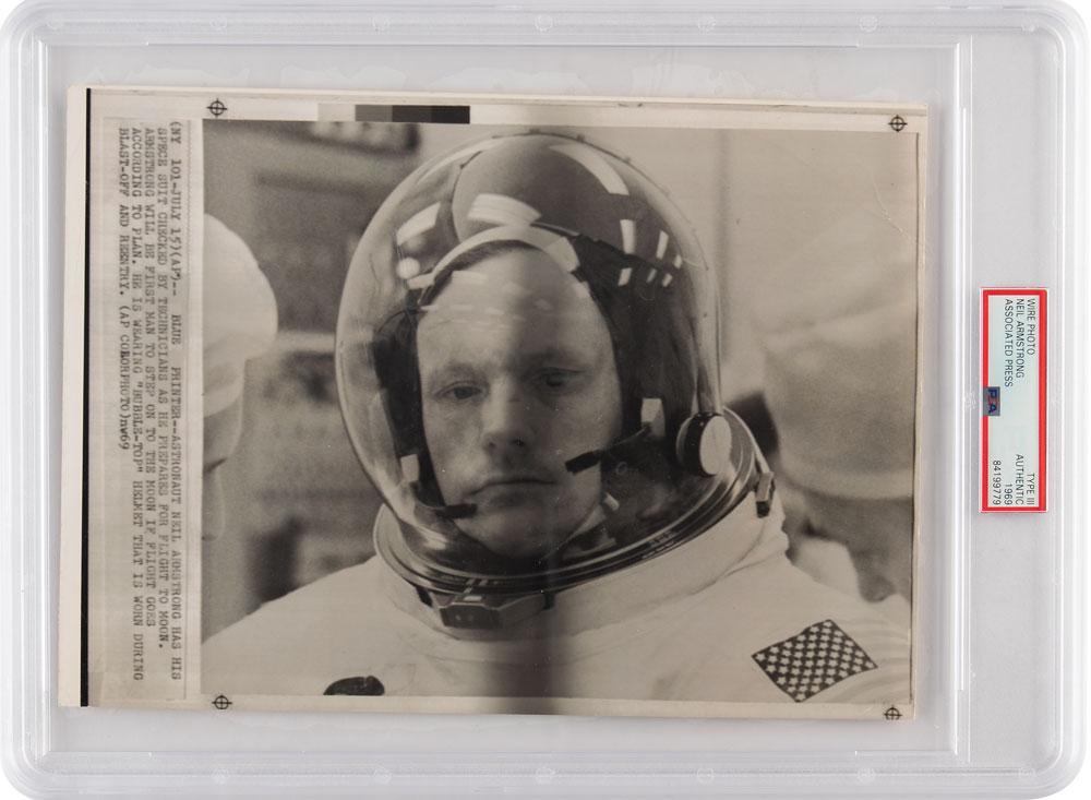 Original vintage circa 1969 glossy 10.25 x 7.5 press photo of astronaut Neil Armstrong during his pre-flight suit prior to landing on the moon with the Apollo 11 mission. The inherent caption notes that this style of 'bubble-top' helmet is worn during blast-off and reentry. Reverse bears an Associated Press credit stamp, and is stamp-dated July 15, 1969. In very good to fine condition, with some creasing, heaviest to the upper right corner. Encapsulated by PSA as an authentic 'Type III' photograph.