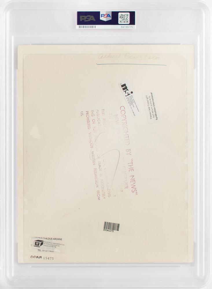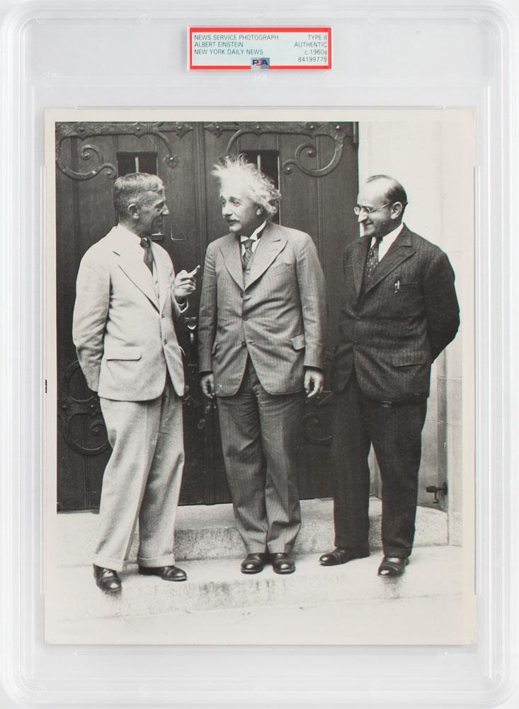 Original vintage circa 1960s glossy 8 x 10 silver gelatin photograph of Albert Einstein with mathematicians Luther P. Eisenhart and Walther Mayer at Princeton. Reverse bears a New York Daily News stamp. In fine condition, with some light creasing to the lower right. Encapsulated by PSA as an authentic 'Type II' photograph.