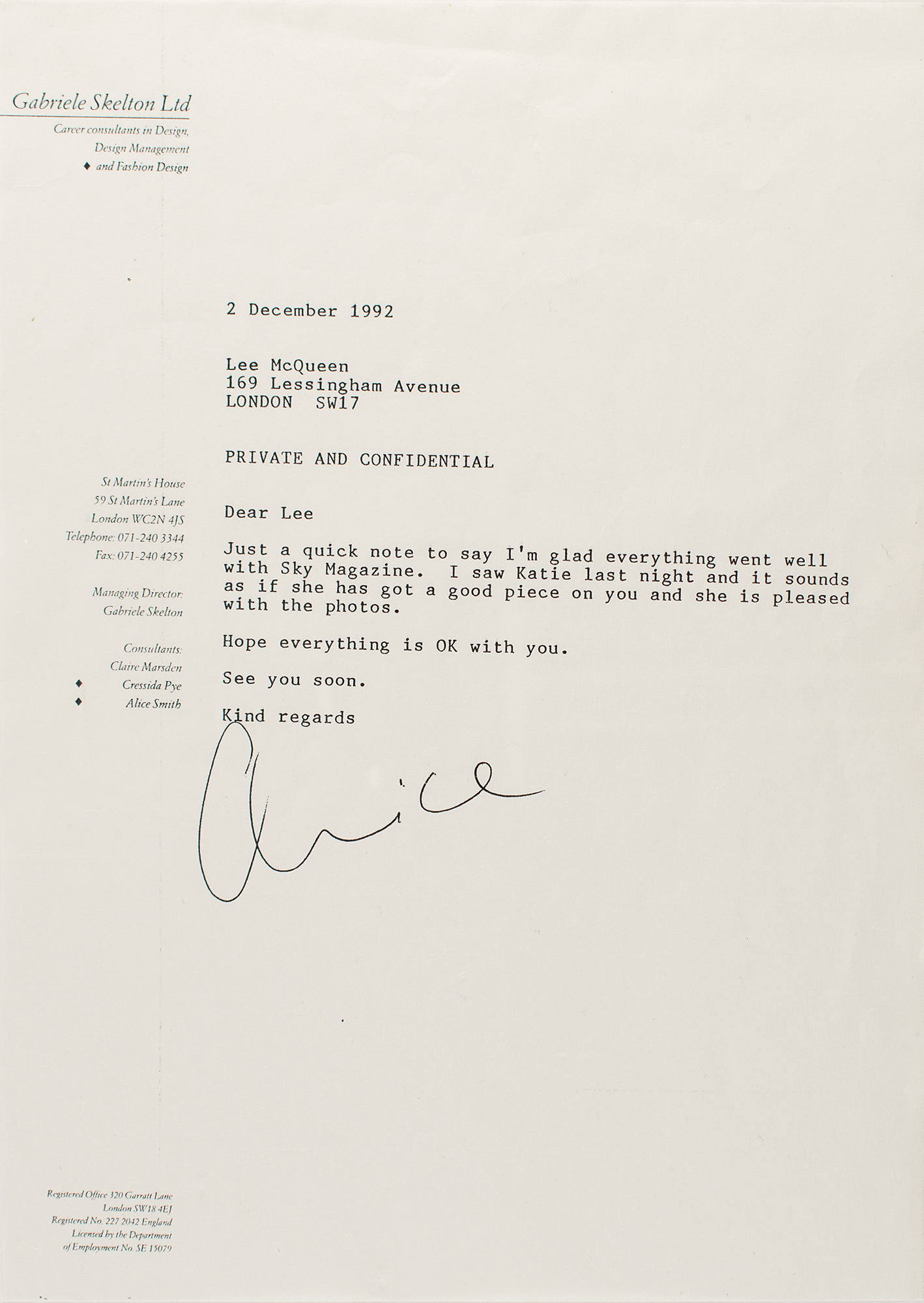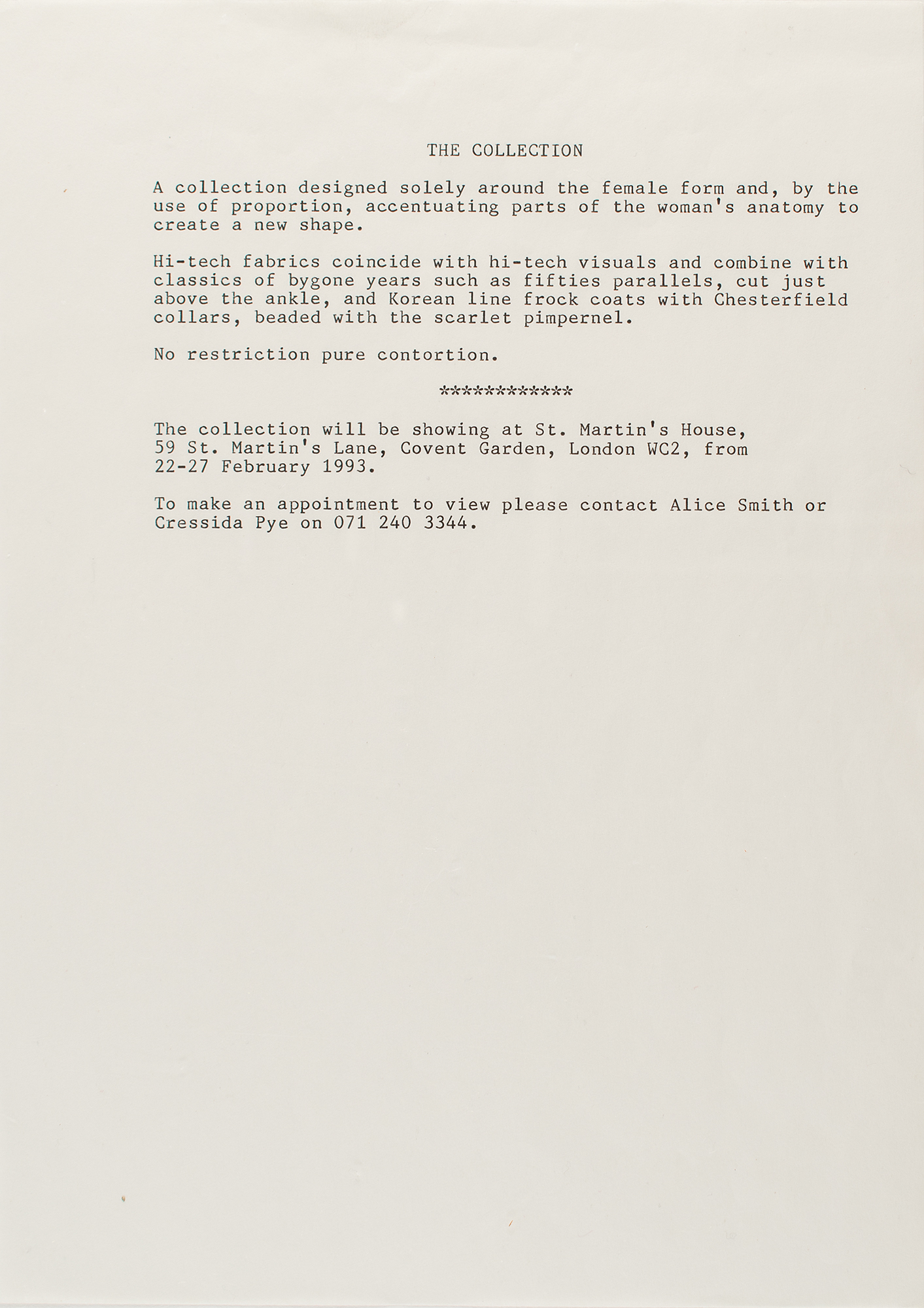 Rare typed overview from Alexander McQueen for his ‘Taxi Driver’ fashion show, which was held at The Ritz in London in March 1993, as part of his Autumn/Winter 1993 collection. The one-page overview reads, in part: “A collection designed solely around the female form and, by the use of proportion, accentuating parts of the woman’s anatomy to create a new shape. Hi-tech fabrics coincide with hi-tech visuals and combine with classics of bygone years such as fifties parallels, cut just above the ankle, and Korean line frock coats with Chesterfield collars, beaded with the scarlet pimpernel. No restriction pure contortion.” Includes a copy of a letter from Gabriele Skelton design consultant Alice Smith, dated December 2, 1992. In fine condition. The entire 'Taxi Driver' collection was notoriously lost by McQueen after he left all of the clothes in a bin liner outside a pub while having a pint. All the contents were lost while only the documents recording its collection details remain.