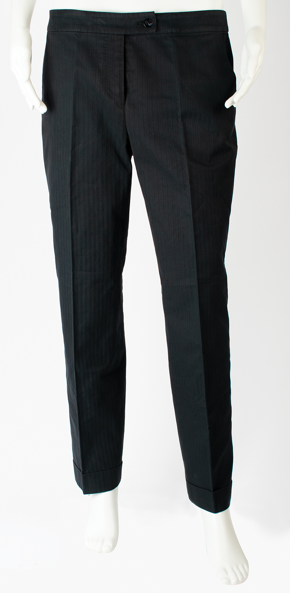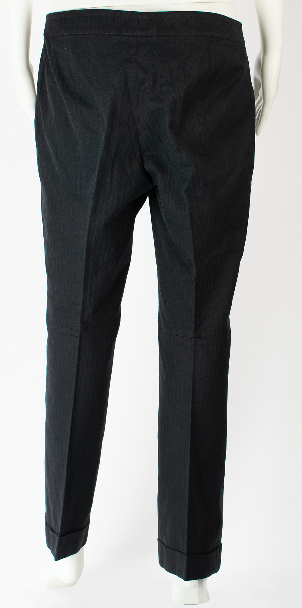 Iconic 'Bumster' trousers designed by Alexander McQueen and made in Italy, featuring his signature extremely low waistline and rolled cuffs. Sewn inside the waistband is a silver-on-gray "Alexander McQueen, Made in Italy" tag; also inside are a size tag ("46") and composition tag ("100% Cotton"). In fine condition. A fantastic, 'off the rack' example of McQueen's trademark design—this low-waisted trouser would help secure his place as one of the most influential fashion designers of the 21st century.