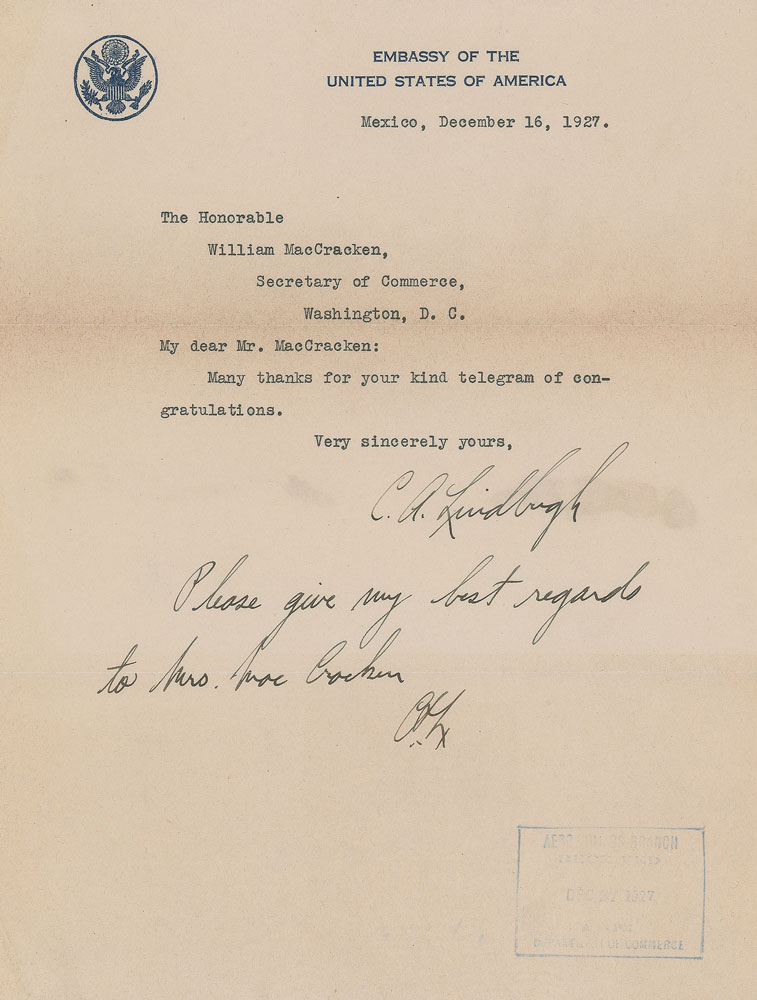 TLS signed “C. A. Lindbergh,” one page, 8 x 10.5, Embassy of the United States of America letterhead, December 16, 1927. Letter to Assistant Secretary of Commerce for Aeronautics William MacCracken, written from Mexico. In full: "Many thanks for your kind telegram of congratulations." Lindbergh adds a handwritten postscript, initialed "C. A. L.," in full: "Please give my best regards to Mrs. MacCracken." In very good to fine condition, with creasing to the two left corners, light irregular toning, and light show-through from old mounting remnants behind the signature.