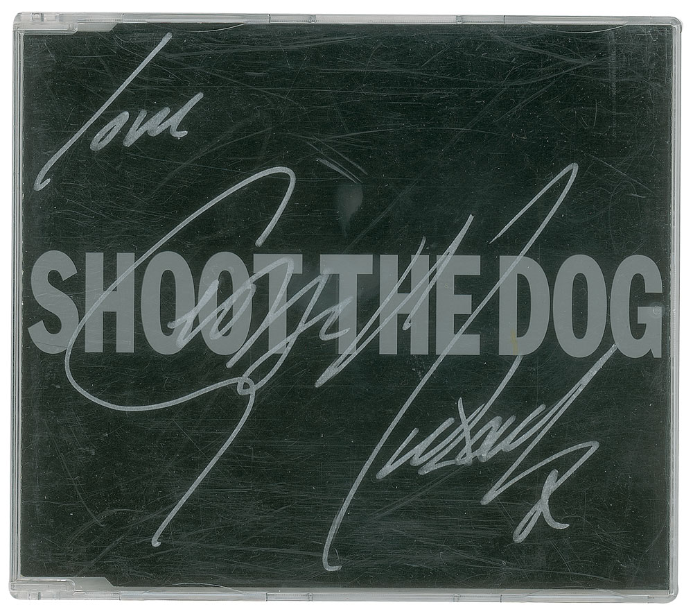 Rare promotional CD for the George Michael single 'Shoot the Dog,' signed on the front of the booklet in silver ink, "Love, George Michael, x." In fine condition. The CD is included.