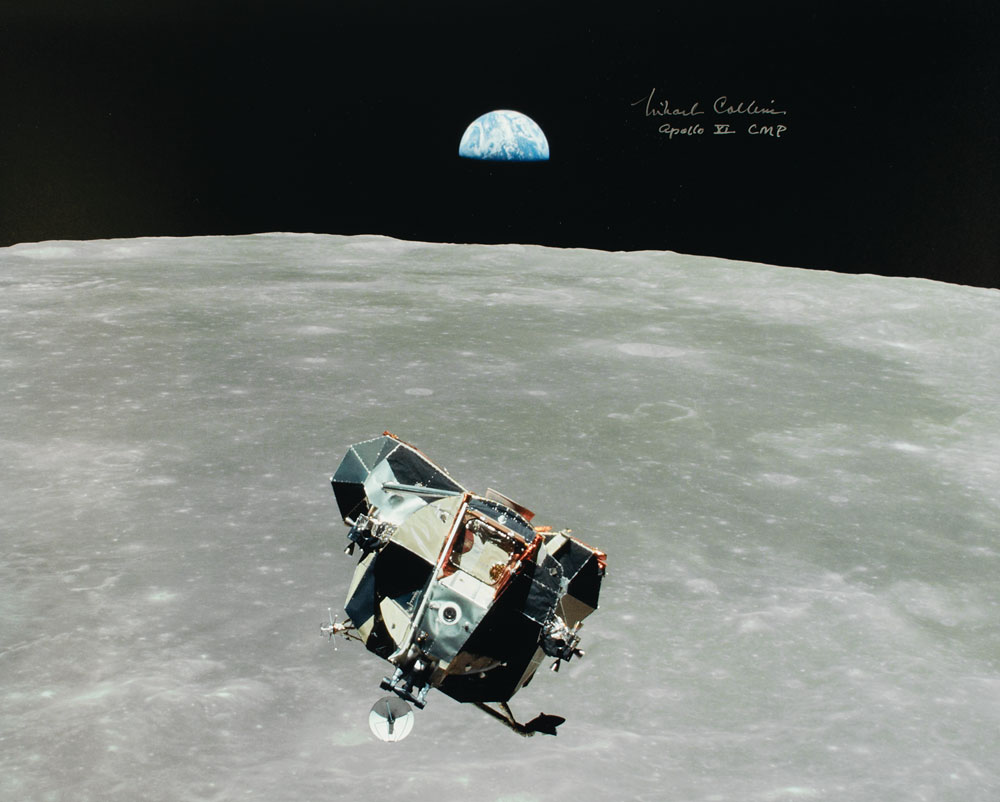 Color satin-finish 20 x 16 photo of the Lunar Module Eagle high above the lunar surface with the Earth visible in the background, signed in silver ink, "Michael Collins, Apollo XI CMP." In very fine condition. Accompanied by a certificate of authenticity from Novaspace.