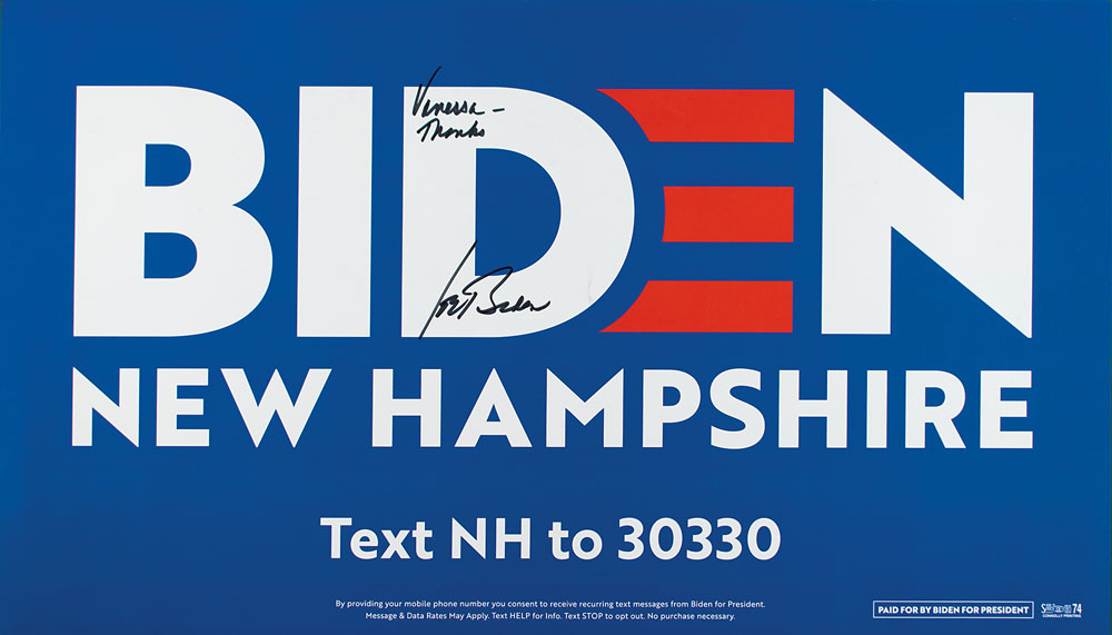 Appealing campaign sign from the 2020 Democratic presidential primary in New Hampshire, 22 x 12.75, signed and inscribed in black felt tip, "Vanessa—Thanks, Joe Biden." In fine condition.