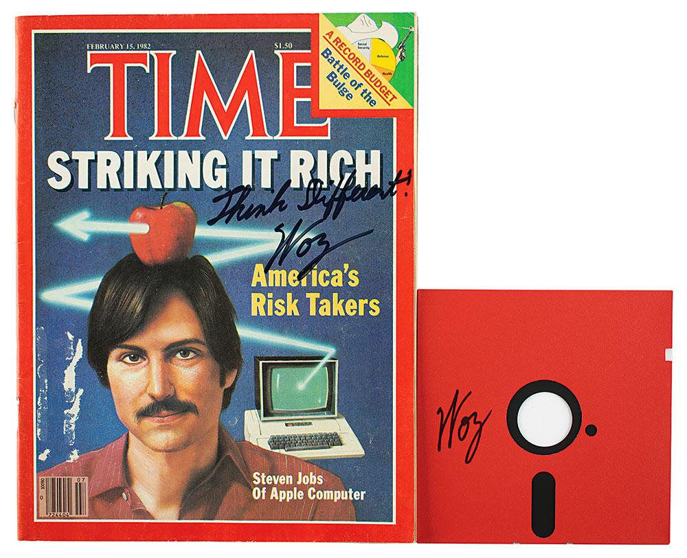 Two items: a Time magazine from February 15, 1982, with an artistic image of Steve Jobs on the cover with headline, "Striking It Rich, America's Risk takers," signed in black felt tip, "Think Different! Woz"; and a red 5.25″ floppy disk signed in black felt tip, "Woz." In overall very good to fine condition, with light handling wear, and a removed mailing label.
