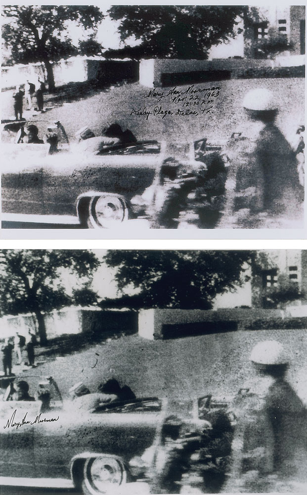 Two satin-finish 10 x 8 photos of the Mary Ann Moorman photograph taken just a fraction of a second after the fatal shot of President John F. Kennedy on November 22, 1963, both signed in black ink by the photographer, who adds to one photo: "Nov. 22, 1963, 12:30 P.M., Dealey Plaza, Dallas, TX." In overall fine condition.