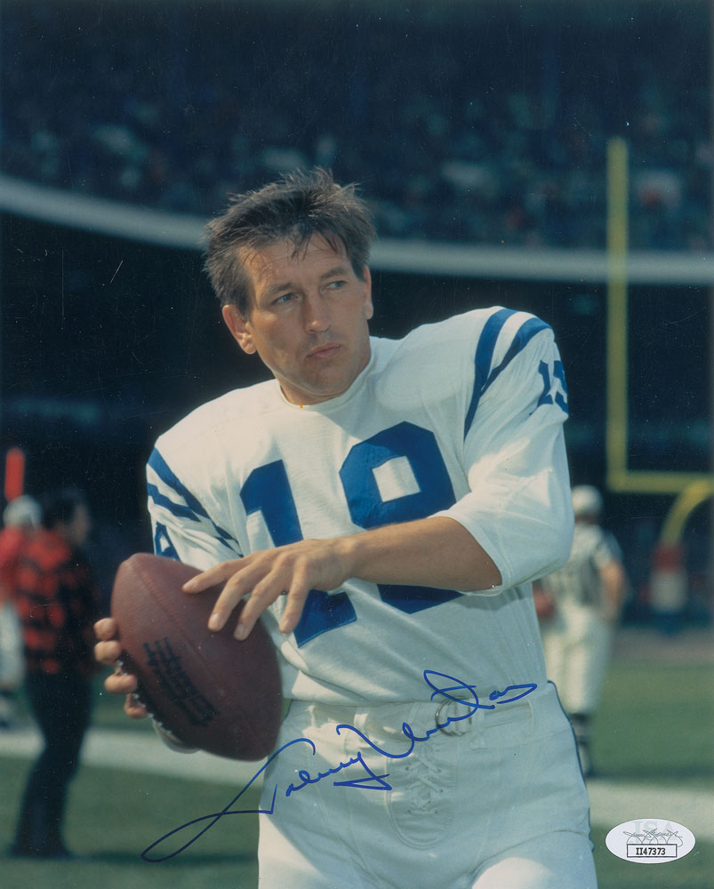 Color glossy 8 x 10 photo of Unitas in his Colts uniform, signed in blue felt tip by the legendary quarterback. In fine condition, with a JSA label affixed to the corner. Accompanied by a certificate of authenticity from JSA.