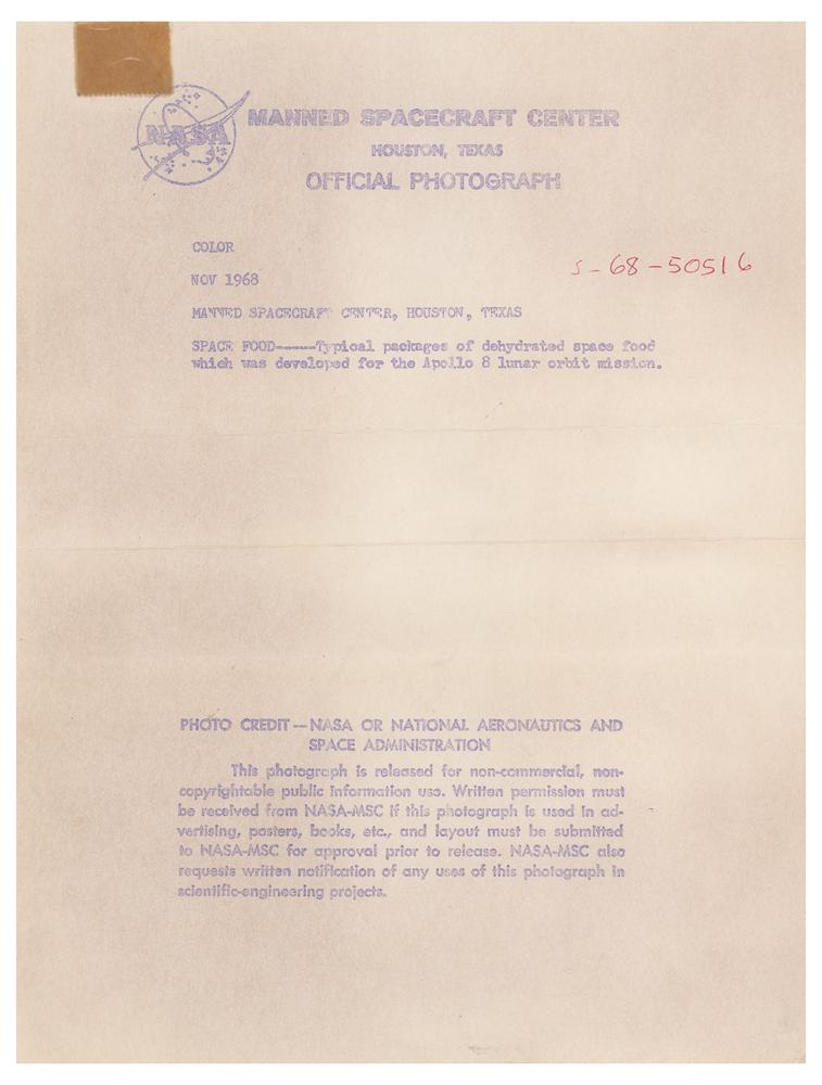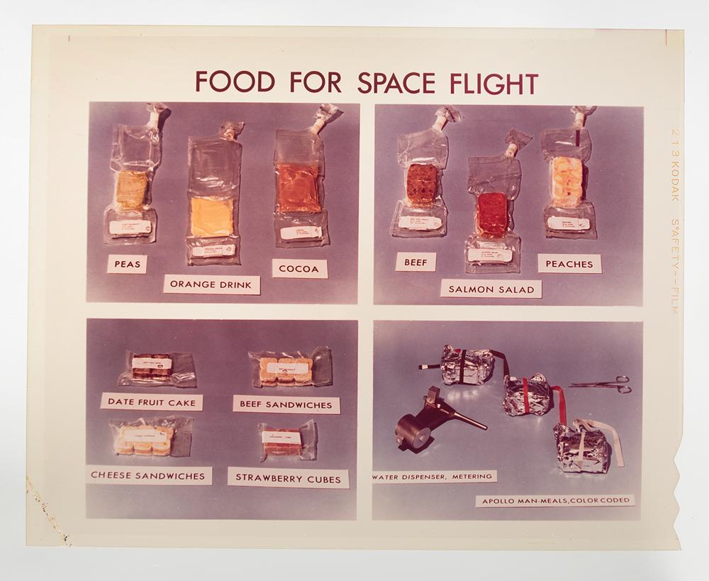 Four color 4 x 5 positive transparencies, with subjects including: the Apollo 11 crew of Neil Armstrong, Buzz Aldrin, and Michael Collins posing in suits in front of a mock Lunar Module; Apollo 12 crewmen Alan Bean and Charles Conrad during training for their lunar EVA; a layout of the specially prepared space food developed for the Apollo program; and a composite image of four layout shots of Apollo space food. Includes official NASA caption sheets for the two space food images. In fine condition.