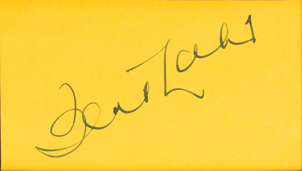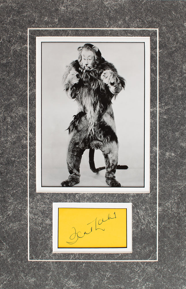 Vintage fountain pen signature, "Bert Lahr,” on a yellow 4 x 2.25 album page, double-matted with a portrait of him as the Cowardly Lion in Wizard of Oz to an overall size of 11 x 17. In very fine condition.