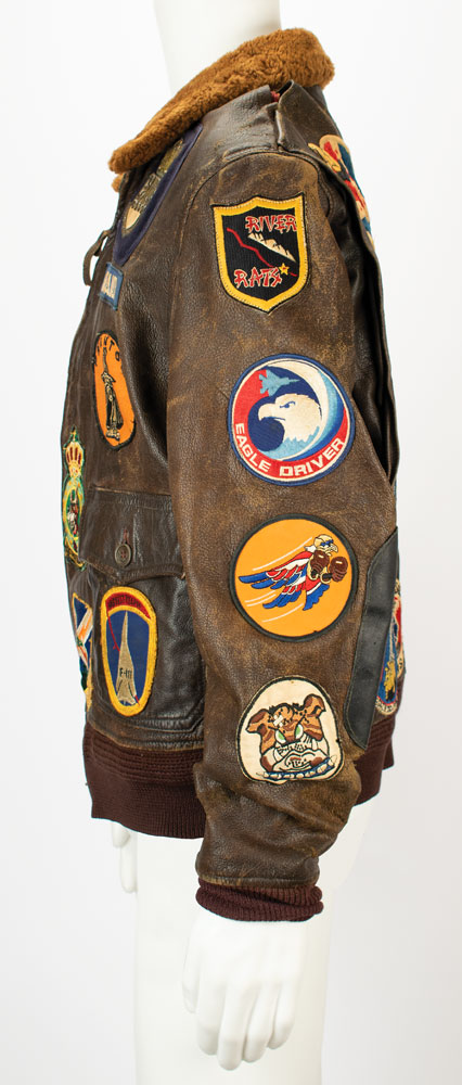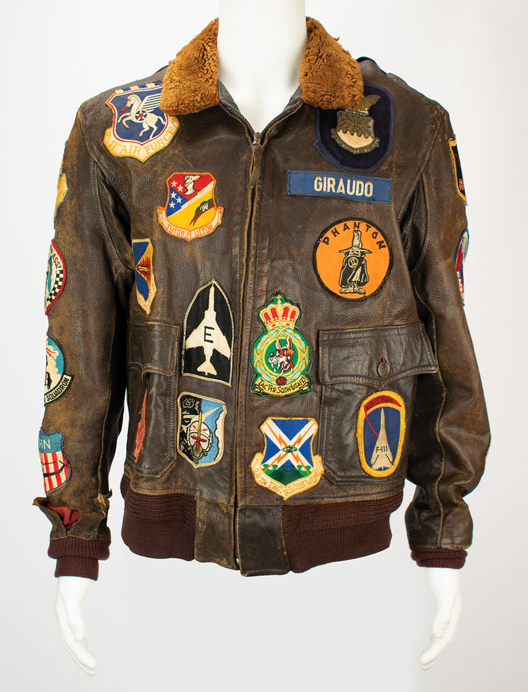 The collection is highlighted by his leather bomber jacket, covered with patches on the front and back. In addition to his white-on-blue nameplate, "Giraudo," there are patches for US Air force, 17th Air Force, 49th Fighter Wing, 355th Fighter Wing, Republic F-105 Thunderchief, Phantom, USAFE 32 Tactical Fighter Squadron, 26th Tactical Reconnaissance Wing, F-111 Harvest Reaper, River Rats, Eagle Driver, US Air Forces in Europe, 526 Tactical Fighter Squadron, UH-1N, 52nd Tactical Fighter Wing, 36th Tactical Airlift Squadron, A-7D Big D, 17th Tactical Reconnaissance Squadron, 25th Fighter Squadron, USAF Fighter Weapons School, 39th Fighter Interceptor Squadron, USAFE Weapons Center, 3595th Combat Crew Training Group, 8th Tactical Fighter Squadron, 9th Tactical Fighter Squadron, 199th Fighter-Interceptor Squadron, 7th Tactical Fighter Squadron, 954th Tactical Fighter Squadron, 333rd Fighter Squadron, 357th Tactical Fighter Squadron, and others.