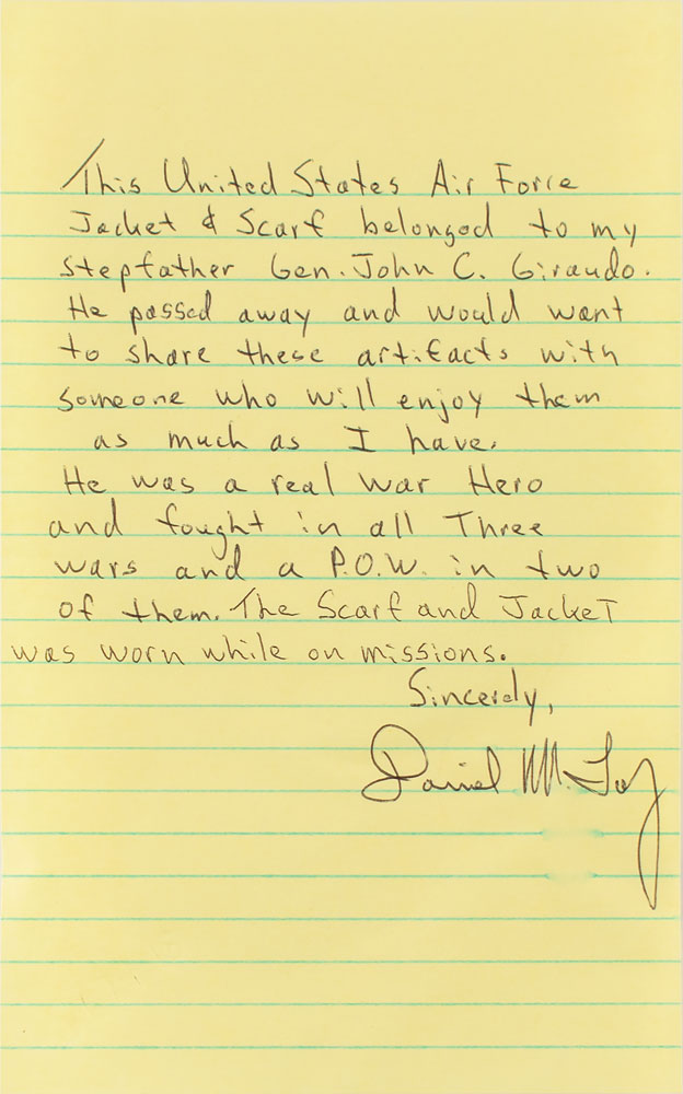 Also includes: his fine red silk scarf featuring the embroidered emblem of the 25th Fighter Squadron, encircled by "John C. Giraudo, Commanding"; two dog tags; his USAF Command Pilot Badge; four vintage photographs showing Giraudo; a 726-page "US Air Force Oral History Interview" transcript; and a handwritten letter of provenance from his stepson, in part: "This United States Air Force jacket & scarf belonged to my stepfather Gen. John C. Giraudo. He passed away and would want to share these artifacts with someone who will enjoy them as much as I have. He was a real war hero and fought in all three wars and a P.O.W. in two of them. The scarf and jacket was worn while on missions." In very good to fine condition, with expected wear, flaking, and some small holes to jacket.